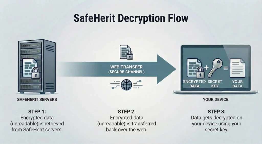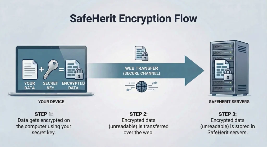 SafeHerit is built so that only you (and, when the time comes, the beneficiaries you choose) can read your information. We encrypt everything on your device before it leaves your browser.